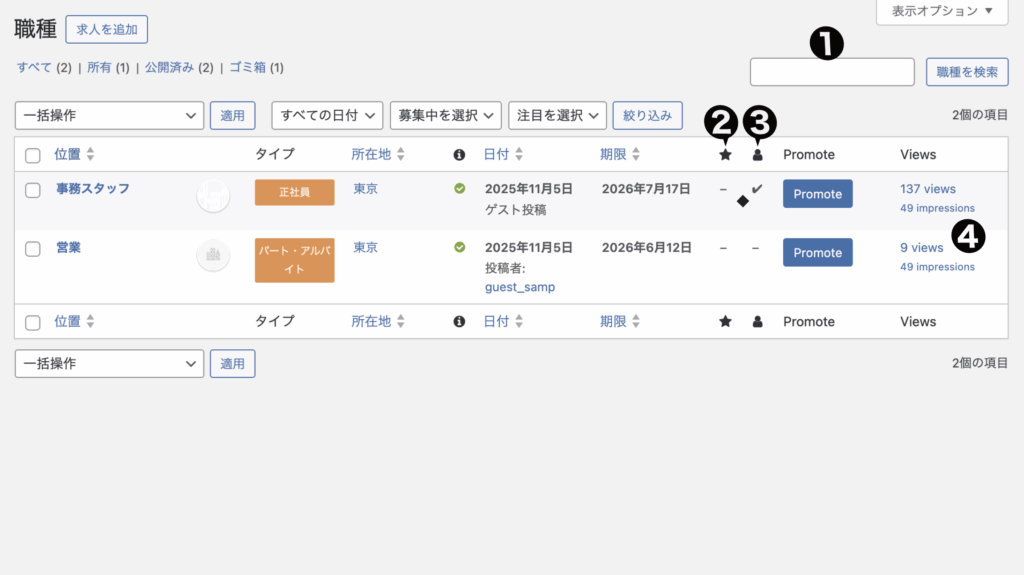 - 各求人詳細ページにおけるViews(閲覧数)とimpression(表示回数)を確認できます。