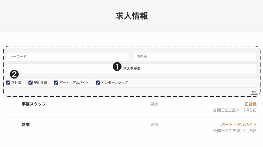 検索機能(点線枠)は、求人数が多くない場合など非表示にすることも可能です。